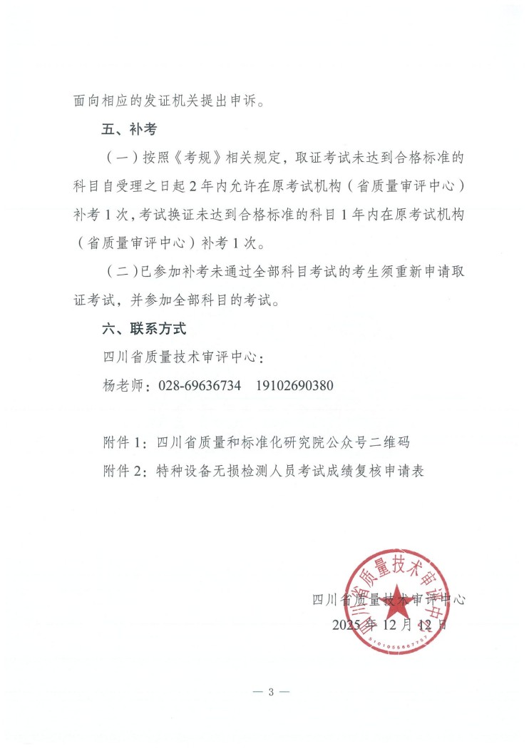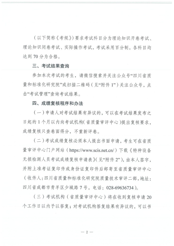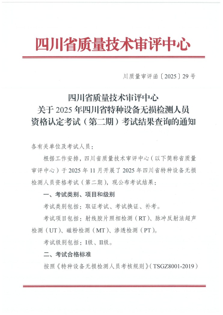 四川省质量技术审评中心关于2025年四川省特种设备无损检测人员资格认定考试(第二期)考试结果查询的通知